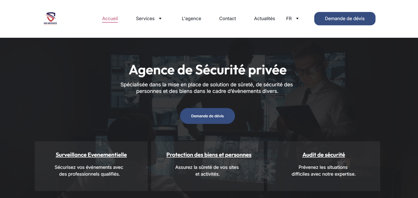Création d’un site internet professionnel pour une société spécialisée dans la surveillance, la protection rapprochée et le gardiennage d’événements. L’objectif était de renforcer la crédibilité de l’entreprise en ligne et de faciliter la prise de contact avec de nouveaux clients.